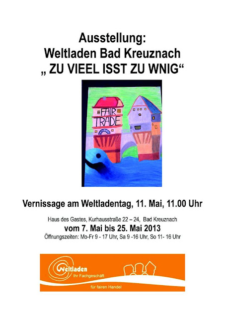Samstag, 11. Mai Ausstellungseröffnung "zu vieel isst zu wnig" Posted on 10. Mai 2013 by admin Anlässlich des Weltladentages ist am Samstag um 11.00 Uhr die Austellungseröffnung „Zu vieel isst zu wnig“ im Haus des Gastes mit Kulturdezernentin Andrea Manz.